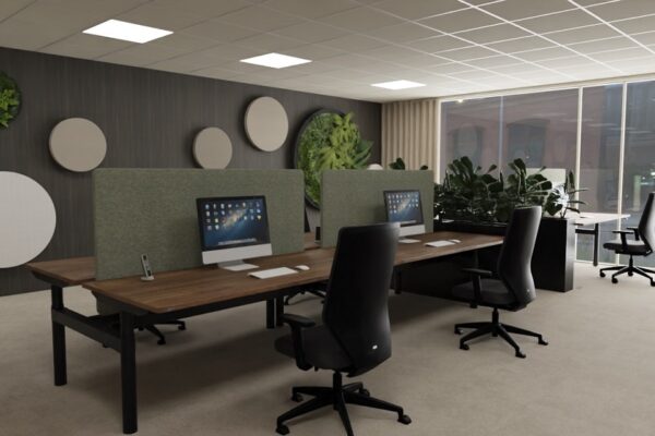 Daarna kijken we naar de specifieke functies van de ruimte. Moet er vooral geconcentreerd kunnen worden gewerkt, of is juist samenwerking belangrijk? Op basis daarvan bepalen we welke opstelling het beste aansluit: zit-sta werkplekken, afgesloten werkplekken, opbergmogelijkheden of akoestische scheidingselementen.